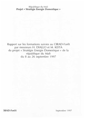 CIRAD-FORET - FRA. 1997. Rapport sur les formations suivies au CIRAD-Forêt par messieurs H. Diallo et M. Keitta du projet "Stratégie Energie Domestique" de la République du Mali du 8 au 26 septembre 1997. s.l. : CIRAD-FORET, 29 p.