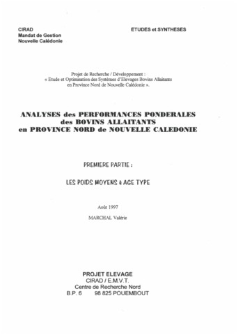 Marchal Valérie. 1997. Analyses des performances pondérales des bovins allaitant en province Nord de Nouvelle Calédonie. Première partie: Les poids moyens à age type. Pouembout : CIRAD-EMVT, 104 p.
