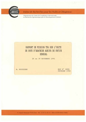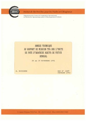 Rouzière André. 1992. Rapport de mission TPA sur l'unité de pâte d'arachide Agrifa de Fatick, Sénégal, du 26 au 30 Novembre 1991. Paris : CIRAD-IRHO, 2 vol. (54 p.) N° de rapport : IRHO-Doc n°2406, N° de rapport : IRHO-Doc n°2407