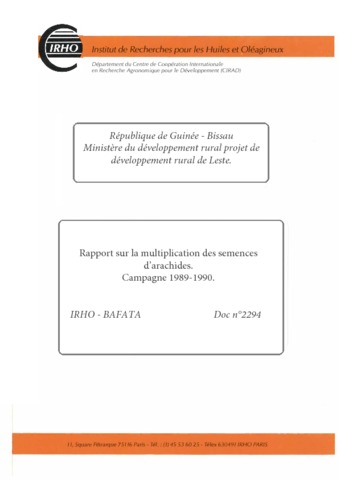 Augusseau Xavier. 1990. République de Guinée-Bissau. Ministère du développement rural. Projet de développement rural de Leste. Rapport sur la multiplication des semences d'arachides. Campagne 1989-1990. Bafatá : CIRAD-IRHO, 35 p. N° de rapport : CIRAD-IRHO Doc n° 2294