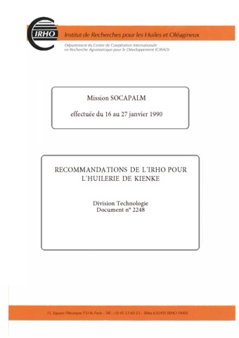 Fanguin J.. 1990. Mission SOCAPALM effectuée du 16 au 27 janvier 1990. Recommandations de l'IRHO pour l'huilerie de Kienké (Cameroun). Paris : CIRAD-IRHO, 29 p. N° de rapport : CIRAD-IRHO Doc n° 2248