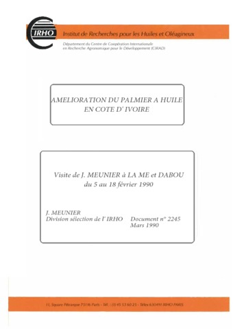 Meunier Jacques. 1990. Amélioration du palmier à huile en Côte d'Ivoire. Visite à LA ME et DABOU du 5 au 18 février 1990. Paris : CIRAD-IRHO, 35 p. N° de rapport : CIRAD-IRHO Doc n° 2245