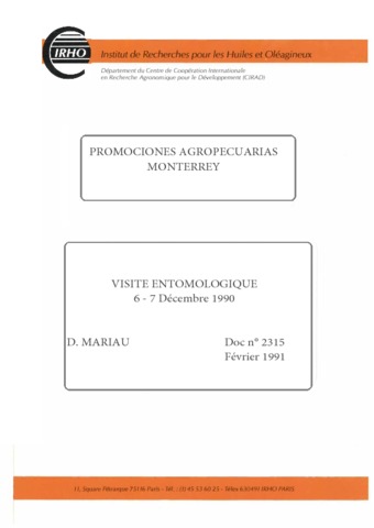 Mariau Dominique. 1991. Promociones agropecuarias Monterrey. Visite entomologique 6-7 décembre 1990. Paris : CIRAD-IRHO, 13 p. N° de rapport : CIRAD-IRHO Doc n° 2315