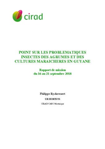 Ryckewaert Philippe. 2018. Point sur les problématiques insectes des agrumes et des cultures maraichères en Guyane. Rapport de mission en Guyane septembre 2018. Montpellier : CIRAD, 16 p.