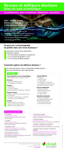 Résumé : 2017 : 10 000 revues éditées par plus de 1 000 éditeurs douteux profitent pour la plupart du modèle auteur-payeur de la publication en libre accès : ils se soucient peu de qualité scientifique ou de bonne conduite en recherche, ils ont un fonctionnement opaque, ils publient rapidement. En quoi est-ce dommageable de publier dans une revue douteuse ? Comment repérer les éditeurs douteux ? Où trouver des infos ? C'est ce que décrit ce poster.
