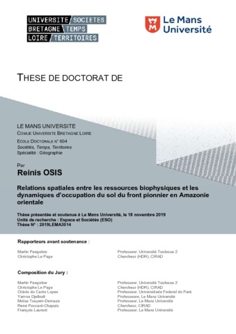Osis Reinis. 2019. Relations spatiales entre les ressources biophysiques et les dynamiques d'occupation du sol du front pionnier en Amazonie orientale. Le Mans : Le Mans Université, 354 p. Thèse de doctorat : Géographie : Le Mans Université