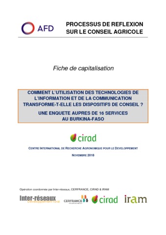 Alexandre Chloé. 2018. Comment l'utilisation des technologies de l'information et de la communication transforme-t-elle les dispositifs de conseil agricole ? Une enquête auprès de 16 services au Burkina Faso. Fiche de capitalisation AFD. Processus de réflexion sur le conseil agricole. Montpellier : CIRAD-AFD, 19 p.