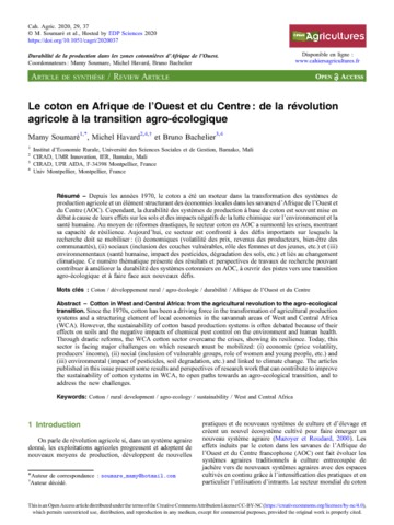 Soumaré Mamy, Havard Michel, Bachelier Bruno. 2020. Le coton en Afrique de l'Ouest et du Centre : de la révolution agricole à la transition agro-écologique. Cahiers Agricultures, 29:37, 8 p.