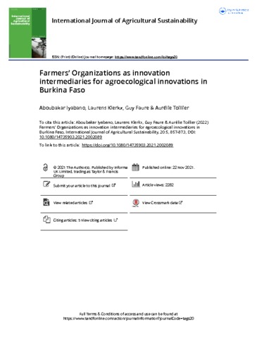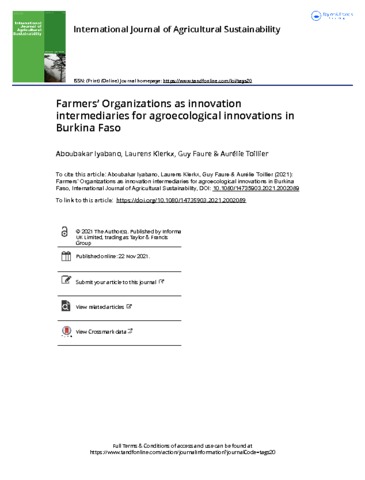 Aboubakar Hayatou Iyabano, Klerkx Laurens, Faure Guy, Toillier Aurélie. 2022. Farmers' Organizations as innovation intermediaries for agroecological innovations in Burkina Faso. International Journal of Agricultural Sustainability, 20 (5) : 857-873.