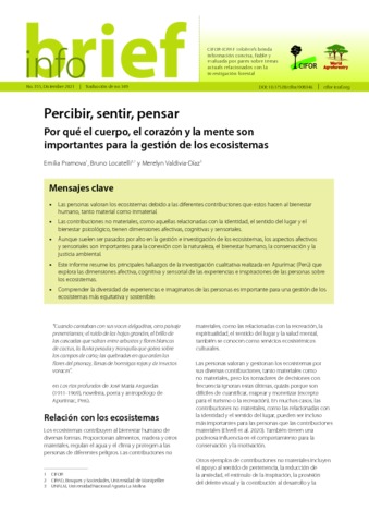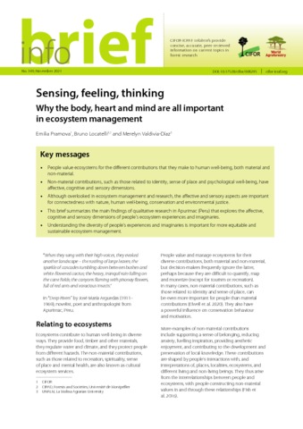 Pramova Emilia, Locatelli Bruno, Valdivia-Díaz Merelyn. 2021. Sensing, feeling, thinking: Why the body, heart and mind are all important in ecosystem management. Bogor : CIFOR, 8 p. (CIFOR infobrief, 349)