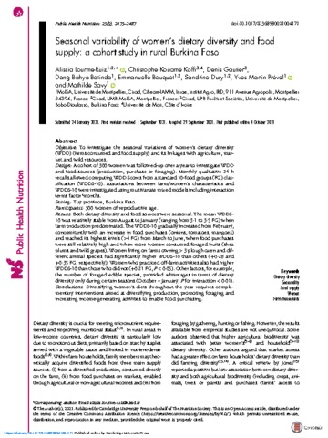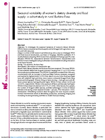 Résumé : Objective: To investigate the seasonal variations of women's dietary diversity (WDD) (items consumed and food supply) and its linkages with agriculture, market and wild resources. Design: A cohort of 300 women was followed-up over a year to investigate WDD and food sources (production, purchase or foraging). Monthly qualitative 24 h recalls allowed computing WDD Scores from a standard 10-food groups (FG) classification (WDDS-10). Associations between farm/women's characteristics and WDDS-10 were investigated using multivariate mixed models including interaction terms factor*months. Setting: Tuy province, Burkina Faso. Participants: 300 women of reproductive age. Results: Both dietary diversity and food sources were seasonal. The mean WDDS-10 was relatively stable from August to January (ranging from 3·1 to 3·5 FG) when farm production predominated. The WDDS-10 gradually increased from February, concomitantly with an increase in food purchases (onions, tomatoes, mangoes) and reached its highest levels (>4 FG) from March to June, when food purchases were still relatively high and when more women consumed foraged fruits (shea plums and wild grapes). Women living on farms owning > 3 plough oxen and different animal species had significantly higher WDDS-10 than others (+0·28 and +0·35 FG, respectively). Women who practiced off-farm activities also had higher WDDS-10 than those who did not (+0·21 FG, P < 0·05). Other factors, for example, the number of foraged edible species, provided advantages in terms of dietary diversity only during certain seasons (October – January, P for interaction < 0·01). Conclusions: Diversifying women's diets throughout the year requires complementary interventions aimed at diversifying production, promoting foraging and increasing income-generating activities to enable food purchasing.