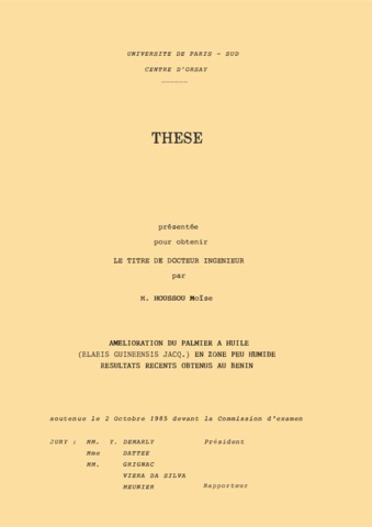 Houssou M.. 1985. Amélioration du palmier à huile (Elaeis guineensis Jacq.) en zone peu humide. Résultats récents obtenus au Bénin. Orsay : Université de Paris-Sud, 186 p. Thèse de docteur-ingénieur : Université de Paris-Sud