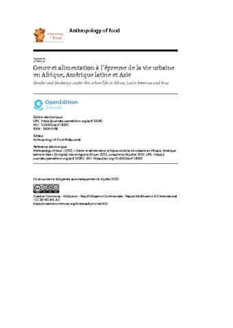 Soula Audrey, Lepiller Olivier, Bricas Nicolas. 2022. Genre et alimentation à l'épreuve de la vie urbaine en Afrique, Amérique Latine et Asie. Anthropology of Food (S17), n.spéc. : 1-10.