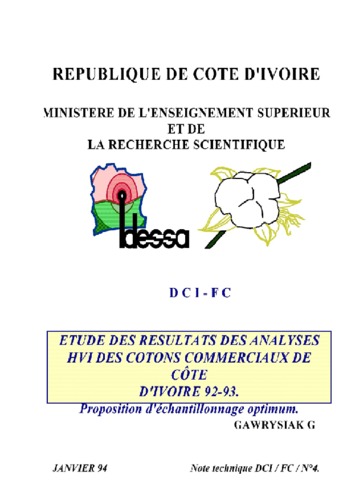 Gawrysiak Gérard. 1994. Etude des résultats des analyses HVI des cotons commerciaux de Côte d'Ivoire 92-93. Proposition d'échantillonnage optimum. s.l. : IDESSA, 21 p.