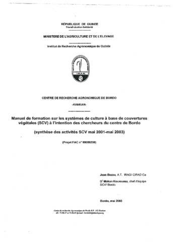 Bozza Jean-Louis, Kourouma Makan, Camara Moussa Tenin. 2003. Manuel de formation sur les systèmes de culture à base de couvertures végétales (SCV) à l'intention des chercheurs du centre de Bordo (synthèse des activités SCV mai 2001-mai 2003). Bordo : Centre de recherche agronomique de Bordo, 54 p.