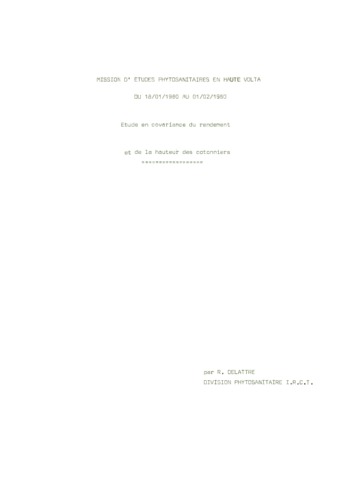 Delattre Robert. 1980. Mission d'études phytosanitaires en Haute Volta du 18/01/1980 au 01/02/1980. Etude en covariance du rendement et de la hauteur des cotonniers. Paris : GERDAT-IRCT, 25 p.
