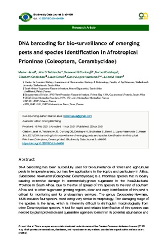 Javal Marion, Terblanche John S., Conlong Desmond, Delahaye Norbert, Grobbelaar Elizabeth, Benoit Laure, Lopez-Vaamonde Carlos, Haran Julien. 2021. DNA barcoding for bio-surveillance of emerging pests and species identification in Afrotropical Prioninae (Coleoptera, Cerambycidae). Biodiversity Data Journal, 9:e64499, 16 p.