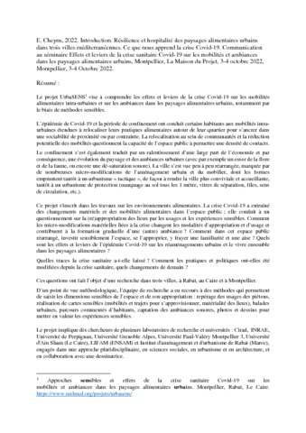 2022. Introduction. Résilience et hospitalité des paysages alimentaires urbains dans trois villes méditerranéennes. Ce que nous apprend la crise Covid-19.