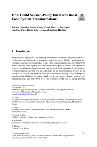 Résumé : The world's food systems must be transformed to make healthier diets more accessible for all, while increasing the sustainability and resilience of these systems, as clearly called for in the 2030 Agenda for Sustainable Development. Scientists and policymakers are among the actors necessary for this transformation. This chapter reviews the importance of the interfaces between science and policy and how these interfaces can become more active and effective. There is no single science—policy interface, but rather many, at different scales, for different functions, addressing different challenges. Strengthening, connecting, and streamlining these interfaces can ensure the consistency and success of food system transformation. To improve science—policy interfaces, the scientific community should (1) generate actionable knowledge, data, and metrics to move beyond obstacles, and address trade-offs and barriers to change, including power asymmetry, path dependency, conflicts of interest, and risk and uncertainty; (2) articulate models, knowledge, and place-based innovations for designing, implementing, and assessing specific transformative pathways—this requires specific arrangements, dialogues, and approaches, including scientific ones; (3) connect expertise mechanisms, such as scientific committees, to address multisectoral and multiscale processes for sustainable development; and (4) strengthen scientific cooperation through major challenge-oriented alliances and programs. Science—policy interfaces can play a decisive role if they are able to dovetail divergent views and overcome polarized debates and sectoral fragmentation. These interfaces must also help us to look ahead and to bridge local and global processes and actions.