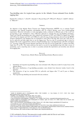 Gaertner Daniel, Guéry Loreleï, Goñi N., Amande J., Pascual-Alayón Pedro J., N'Gom F., Pereira J., Addi E., Ailloud L., Beare D.. 2022. Tag-shedding rates for tropical tuna species in the Atlantic Ocean estimated from double-tagging data. Fisheries Research, 248:106211, 9 p.