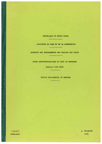 Teissier Jacques. 1978. Aménagement des vallées des Volta. Étude morphopédologique du bloc de Mankarga. Échelle 1/20 000e. Notice explicative et annexes. Montpellier : GERDAT-IRAT, 17 p.