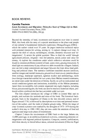 Ancey Véronique. 2023. Camilla Toulmin. Land, investment, and migration: Thirty-five years of village life in Mali. Book review. Oxford: Oxford University Press, 2020. ISBN 978-0198852766 (HB), 284 pp.. Nomadic Peoples, 27 (1) : 141-145.