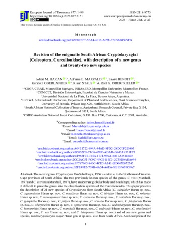 Haran Julien, Marvaldi Adriana, Benoit Laure, Oberlander Kenneth, Stals Riaan, Oberprieler Rolf G.. 2023. Revision of the enigmatic South African Cryptolaryngini (Coleoptera, Curculionidae), with description of a new genus and twenty-two new species. European Journal of Taxonomy, 877 (1) : 1-89.
