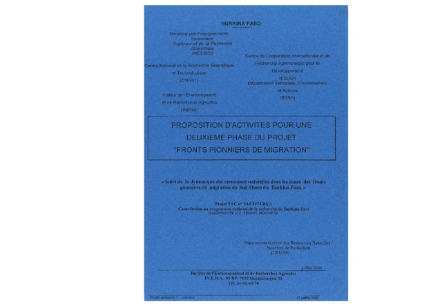 MESSRS - BFA, CNRST - BFA, CIRAD-TERA - FRA, INERA - BFA. 2000. Suivi de la dynamique des ressources naturelles dans les zones des fronts pionniers de migration du Sud-Ouest du Burkina Faso. Proposition d'activités pour une deuxième phase du projet. Fronts pionniers de migration. Projet FAC n°94/CD/78/BKA. Ouagadougou : INERA, 46 p.