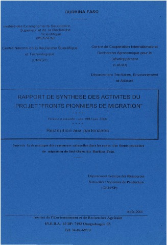 MESSRS - BFA, CNRST - BFA, CIRAD-TERA - FRA, INERA - BFA. 2000. Suivi de la dynamique des ressources naturelles dans les zones des fronts pionniers de migration du Sud-Ouest du Burkina Faso. Rapport de synthèse des activités du projet Fronts pionniers de migration. Période d'activités : juin 1997-juin 2000. Restitution aux partenaires.. Ouagadougou : INERA, 64 p.