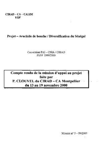 Clouvel Pascal. 2000. Projet Arachide de bouche / Diversification du Sénégal. Compte rendu de la mission d'appui au projet du 13 au 19 novembre 2000. Montpellier : CIRAD-CA, 18 p. Autre type de numéro : Mission N° 5-99/2000