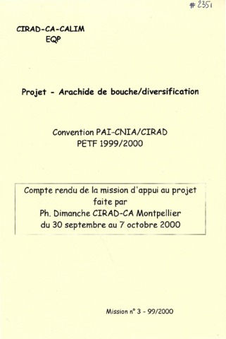 Dimanche Philippe. 2000. Projet Arachide de bouche / Diversification. Compte rendu de la mission d'appui au projet du 30 septembre au 7 octobre 2000 [Sénégal]. Montpellier : CIRAD-CA, 98 p. Autre type de numéro : Mission N°3-99/2000