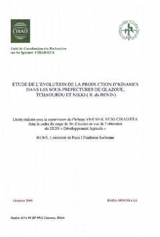 Baba-Moussa I.I.. 2000. L'étude de l'évolution de la production d'ignames dans les sous-préfectures de Glazoué, Tchaourou et Nikki (R. du Bénin). Paris : Université Paris-Sorbonne, 66 p. Mémoire DESS : Développement agricole : Université Paris-Sorbonne