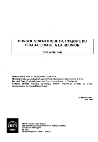 Dollé Vincent, Doreau Michel, Faye Bernard, Lhoste Philippe. 1999. Conseil scientifique de l'équipe du Cirad-Élevage à la Réunion, 27-30 avril 1999. Montpellier : CIRAD-DS, 27 p. N° de rapport : CIRAD-MIPA-PHL N° 446
