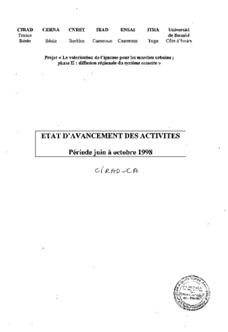 CIRAD-CA - FRA, CERNA - BEN, CNRST - BFA, IRAD - CMR, ENSAI - CMR, ITRA - TGO, Université de Bouaké - CIV. 1998. La valorisation de l'igname pour les marchés urbains. Phase 2 : diffusion régionale du système cossette. État d'avancement des activités, période juin à octobre 1998. Compte-rendu d'activité N°2 au 31/10/98. Montpellier : CIRAD, 76 p.