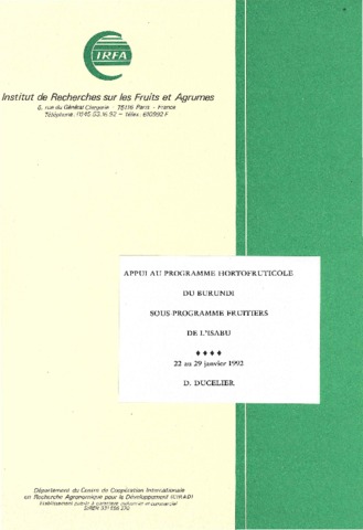 Ducelier Daniel. 1992. Appui au programme hortofruticole du Burundi, sous-programme fruitiers de l'ISABU. 22 au 29 janvier 1992. Paris : CIRAD-IRFA, 23 p.