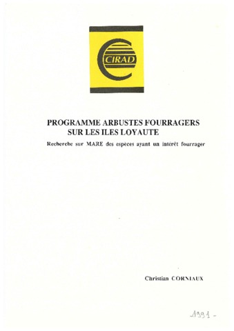 Corniaux Christian. 1991. Programme arbustes fourragers sur les Iles Loyauté. Recherche sur MARE des espèces ayant un intérêt fourrager [Nouvelle-Calédonie]. Montpellier : CIRAD, 19 p.