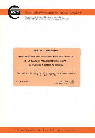 Julia Jean-François. 1990. Recherches sur les possibles insectes vecteurs de la maladie " Amarelecimento fatal " du palmier à huile au Brésil. Évaluation du programme en cours et propositions (7 au 13/11/1989). Paris : CIRAD-IRHO, 8 p. N° de rapport : CIRAD-IRHO N° 2237