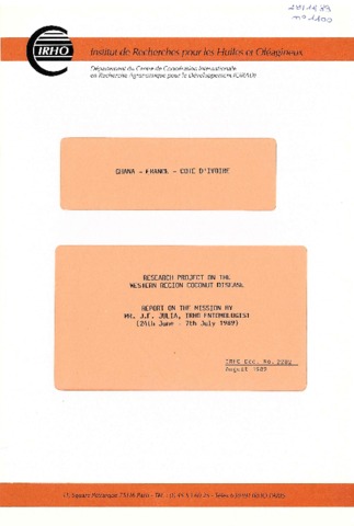 Julia Jean-François. 1989. Ghana - France - Côte d'Ivoire. Research project on the Western region coconut disease. Report on the mission (24th June-7th July 1989). Paris : CIRAD-IRHO, 14 p. N° de rapport : CIRAD-IRHO N° 2202