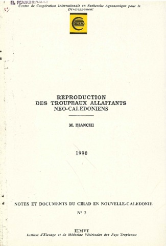 Bianchi Manuel. 1990. Reproduction des troupeaux allaitants néo-calédoniens. Nouméa : CIRAD-IEMVT, 10 p. (Notes et documents / CIRAD, 2)