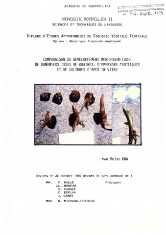 Kwa Moïse. 1990. Comparaison du développement morphogénétique de bananiers issus de graines, d'embryons zygotiques et de cultures d'apex in vitro. Montpellier : USTL [Université des sciences et techniques du Languedoc], 56 p. Memoire DEA : Biologie végétale tropicale. Botanique tropicale appliquée : Université des sciences et techniques du Languedoc