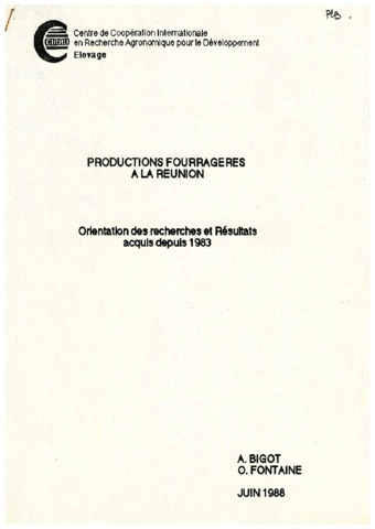 Bigot Alain, Fontaine Olivia. 1988. Productions fourragères à la Réunion. Orientation des recherches et résultats acquis depuis 1983. Saint-Denis : CIRAD, 22 p.