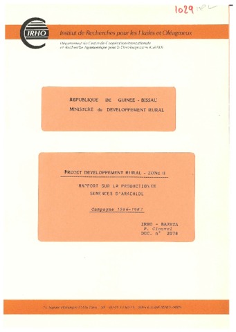 Clouvel Pascal. 1987. République de Guinée-Bissau. Ministère du développement rural. Projet développement rural, zone II. Rapport sur la production de semences d'arachide. Campagne 1986-1987. Montpellier : CIRAD, 60 p. N° de rapport : IRHO Doc n°2078