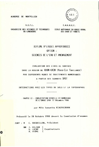 Kingpaiboon Sununtha. 1988. Évaluation des états de surface dans la région de Khon-Kaen (Nord-Est Thaïlande) par différents modes de traitements numériques à partir des données Spot. Interactions avec les types de sols et la topographie. Partie I. Étude : bibliographique. Partie II : exploitation visuelle et numérique de l'image Spot 17 décembre 1986. Montpellier : USTL [Université des sciences et techniques du Languedoc], 56 p. Mémoire DEA : Sciences de l'eau et aménagement : Université des sciences et techniques du Languedoc