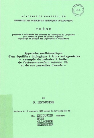 Lecoustre René. 1988. Approche mathématique d'un équilibre biologique à trois antagonistes. Exemple du palmier à huile, de Coelanomenodera minuta Uh. et de ses parasites d'oeufs. Montpellier : USTL [Université des sciences et techniques du Languedoc], 292 p. Thèse de docteur-ingénieur : Physiologie et biologie des organismes et populations : Université des sciences et techniques du Languedoc