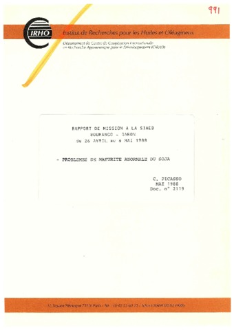 Picasso Christian. 1988. Rapport de mission à la SIAEB Boumango-Gabon du 26 avril au 6 mai 1988. Problèmes de maturité anormale du soja. Paris : CIRAD-IRHO, 13 p. N° de rapport : CIRAD-IRHO N° 2119