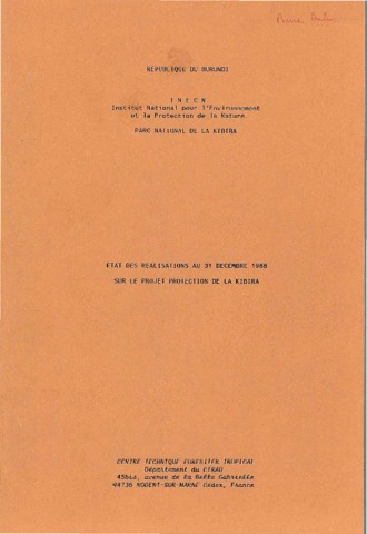 Dubus Pierre, Curie Philippe. 1989. Parc national de la Kibira [Burundi]. État des réalisations au 31 décembre 1988 sur le projet protection de la Kibira. Nogent-sur-Marne : CIRAD-CTFT, 215 p.