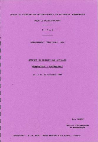Sarah Jean-Louis. 1987. Rapport de mission aux Antilles nématologie-entomologie, du 15 au 25 novembre 1987. Montpellier : CIRAD-IRFA, 15 p.
