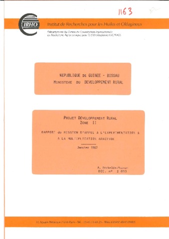 Bockelée Morvan A.. 1987. Projet développement rural zone II. Rapport de mission d'appui à l'expérimentation et à la multiplication arachide. 26-30 janvier 1987 [Guinée-Bissau]. Paris : CIRAD-IRHO, 51 p. ["note_numeros_type_typename_" not defined] : CIRAD-IRHO N° 2055