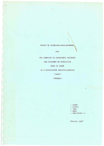 CADEF - SEN, CIEPAC - FRA, ISRA - SEN, ENEA - SEN, CIRAD-DSA - FRA. 1987. Projet de recherche-développement sur une démarche de changement maîtrisé des systèmes de production dans le cadre de l'association intervillageoise " Cadef " (Sénégal). Montpellier : CIRAD-DSA-CADEF, 71 p.