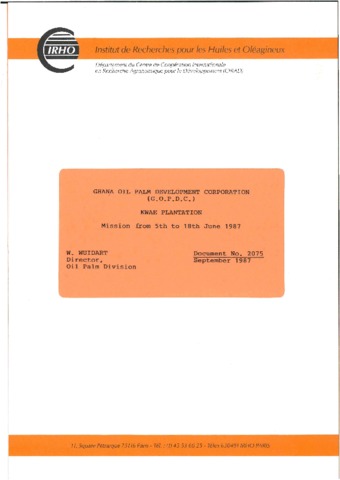 Wuidart Willy. 1987. Ghana oil palm development corporation (GOPDC). Kwae plantation. Mission from 5th to 18th June 1987. Paris : CIRAD-IRHO, 198 p. N° de rapport : CIRAD-IRHO No. 2075